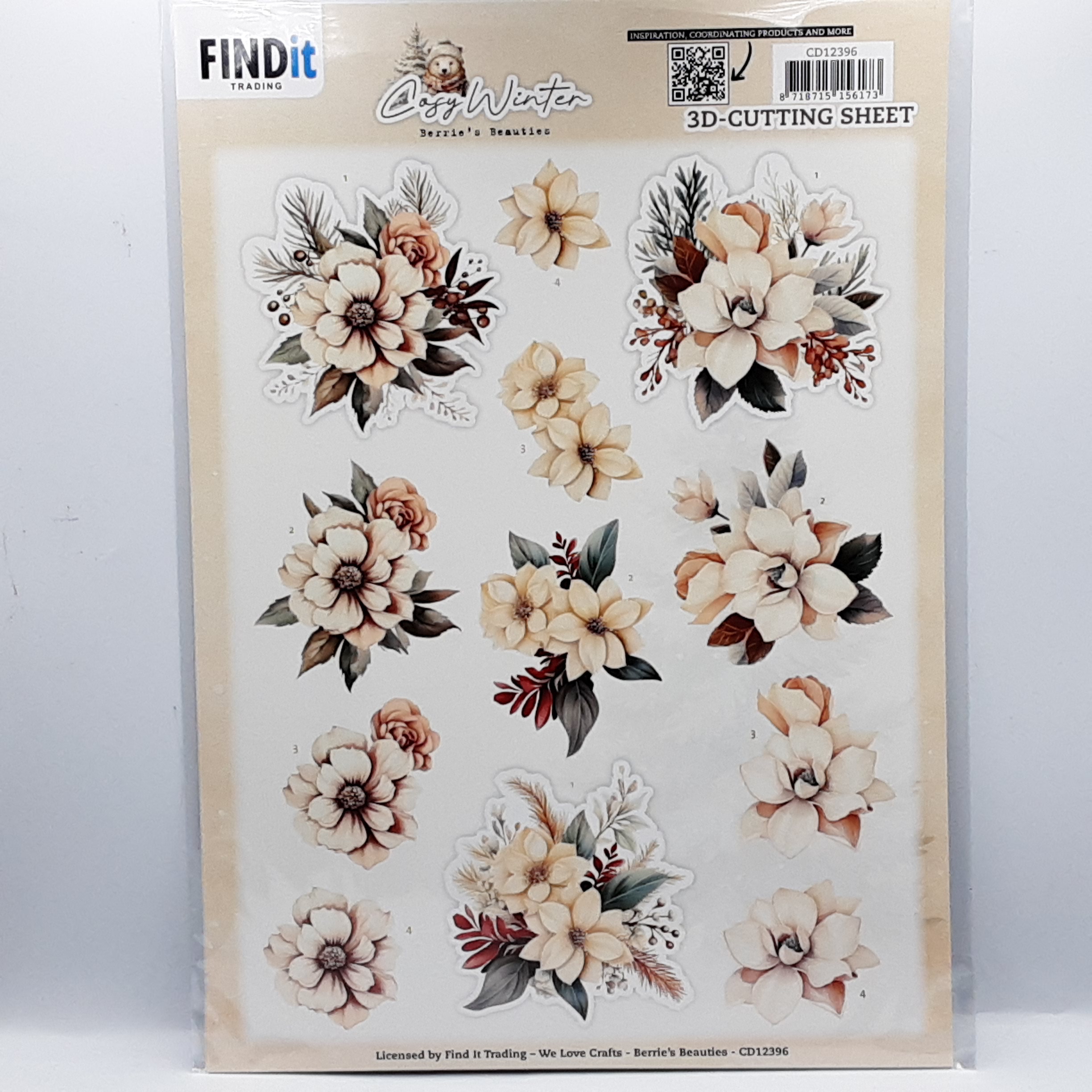 Uitdrukvel met 3 3D plaatjes van winterse bloemen in mandjes