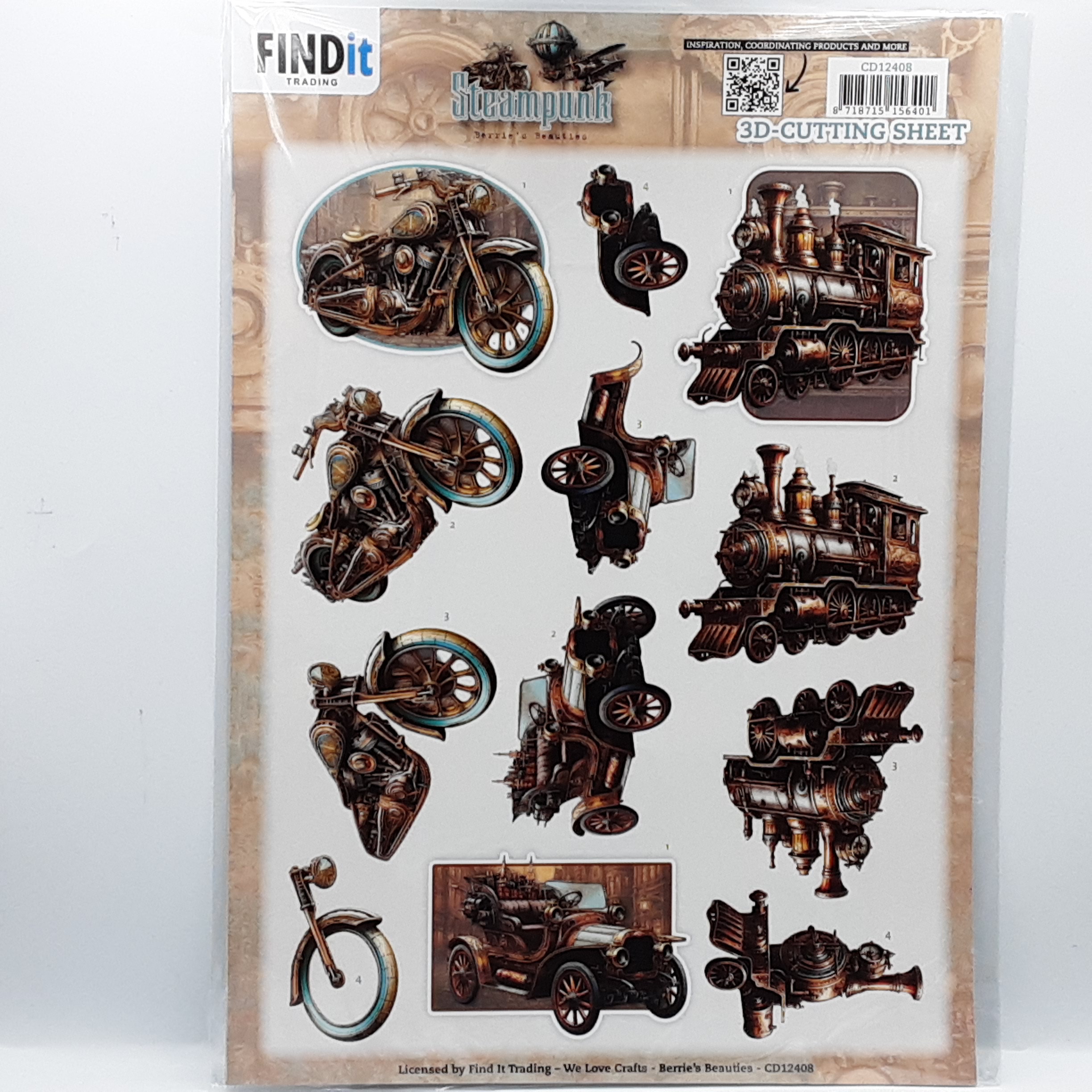 Knipvel met steampunk plaatjes van motorvoertuigen, ook verkrijgbaar in push out