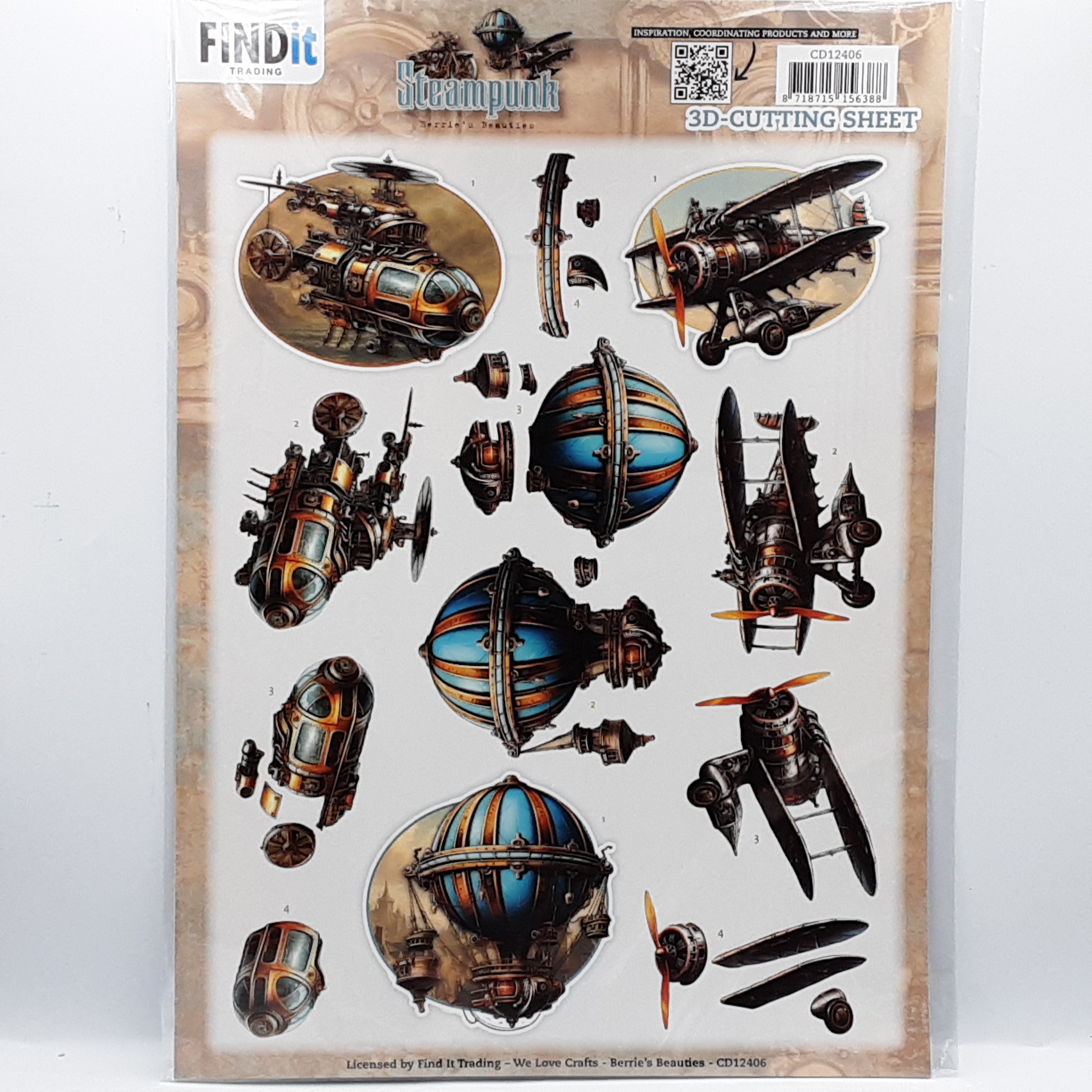 Knipvel met steampunk plaatjes van vliegtuigen, ook verkrijgbaar in push out