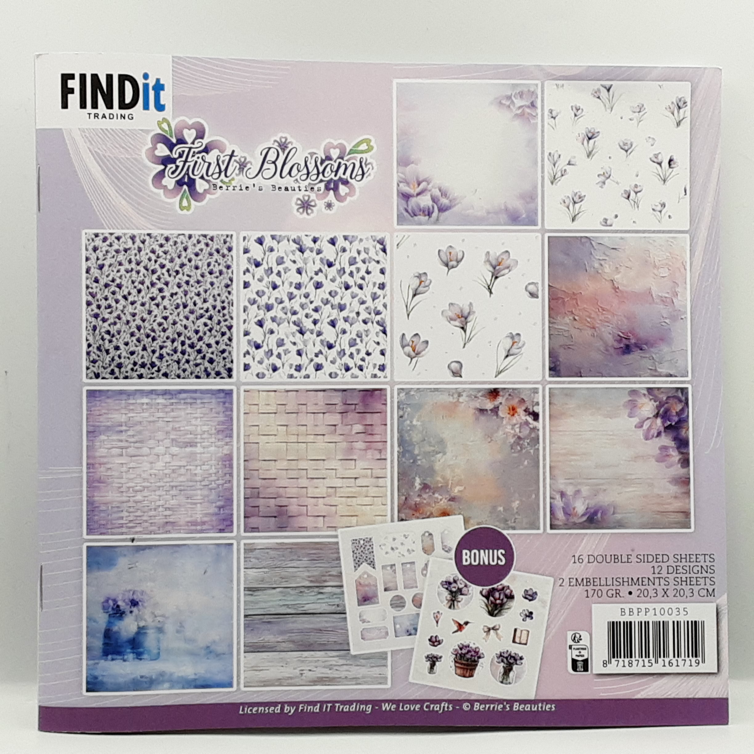 Paperpack 20 x 20 cm met 16 dubbelzijdig bedrukte vellen designpapier en 2 embellishment vellen Paarse voorjaars dessins