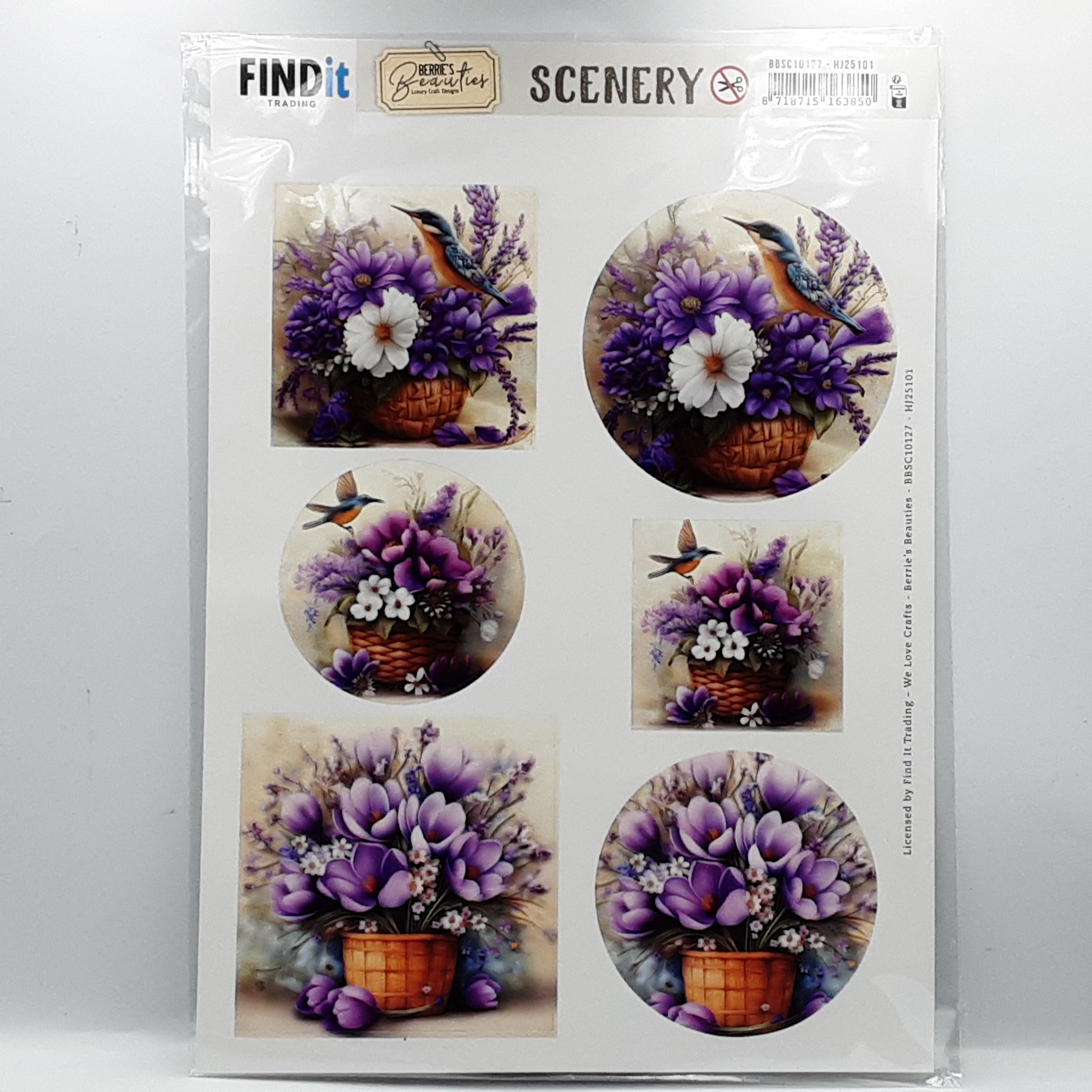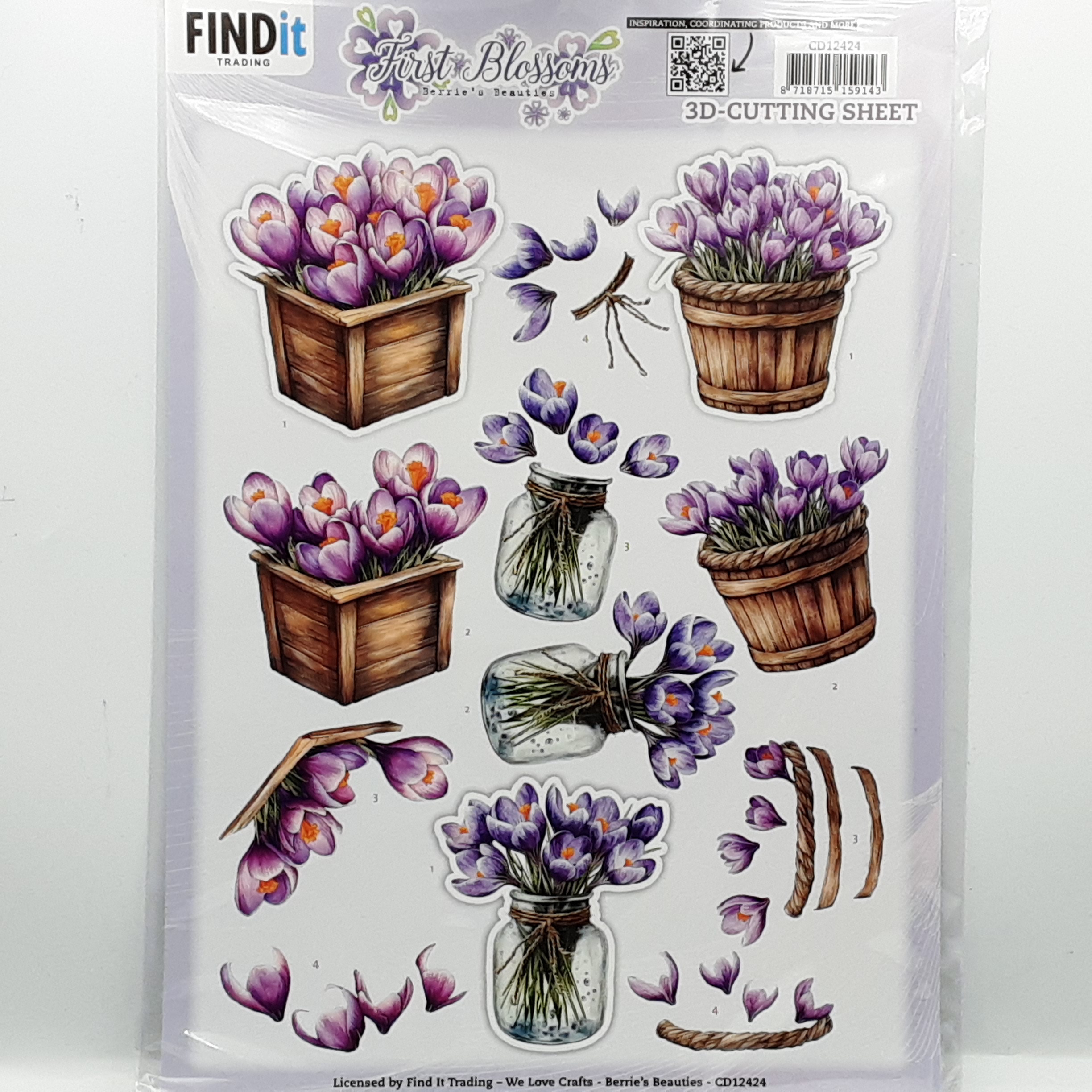 Knipvel met 3 plaatjes om in 3D op te bouwen , Ook verkrijgbaar in push out Paarse krokussen in een krans