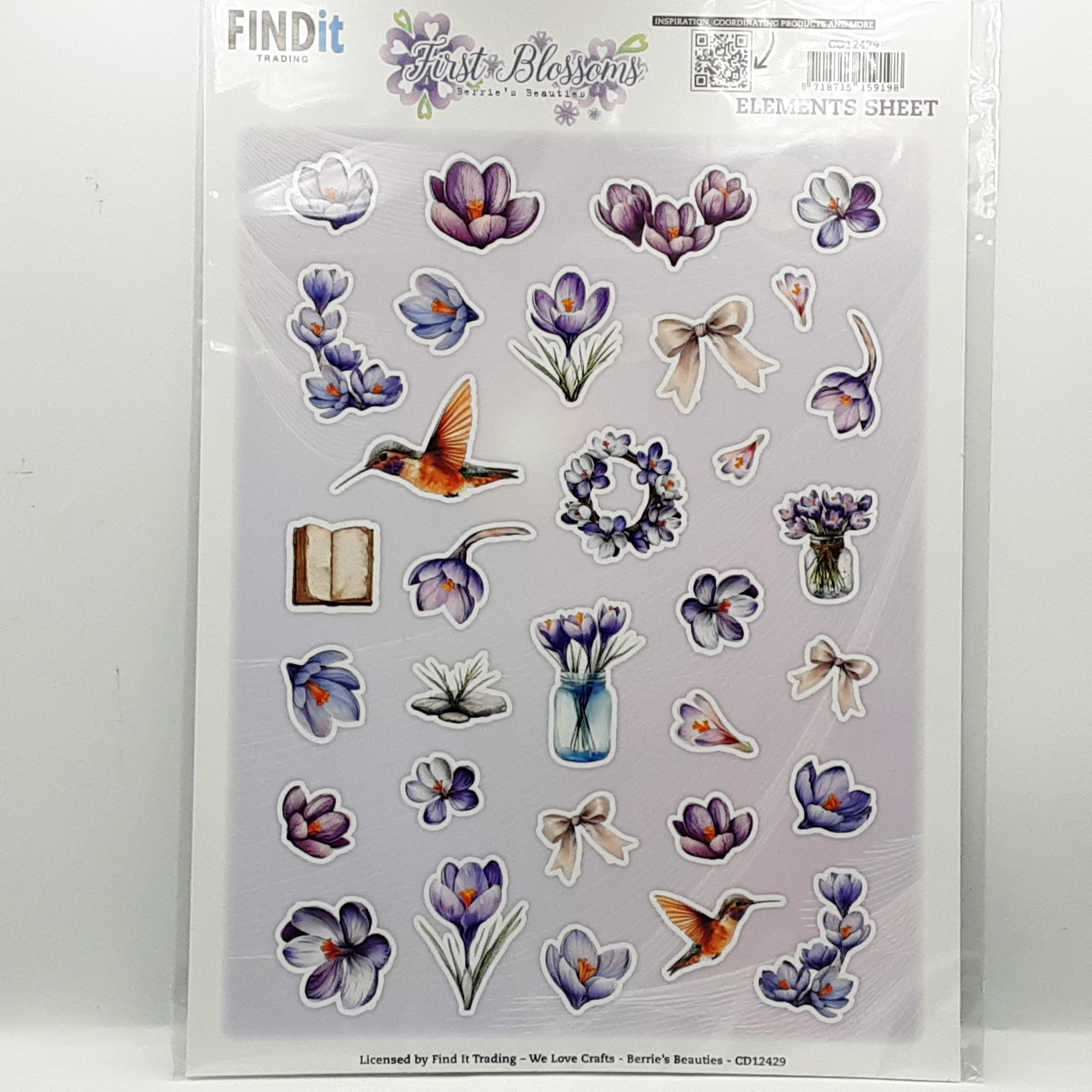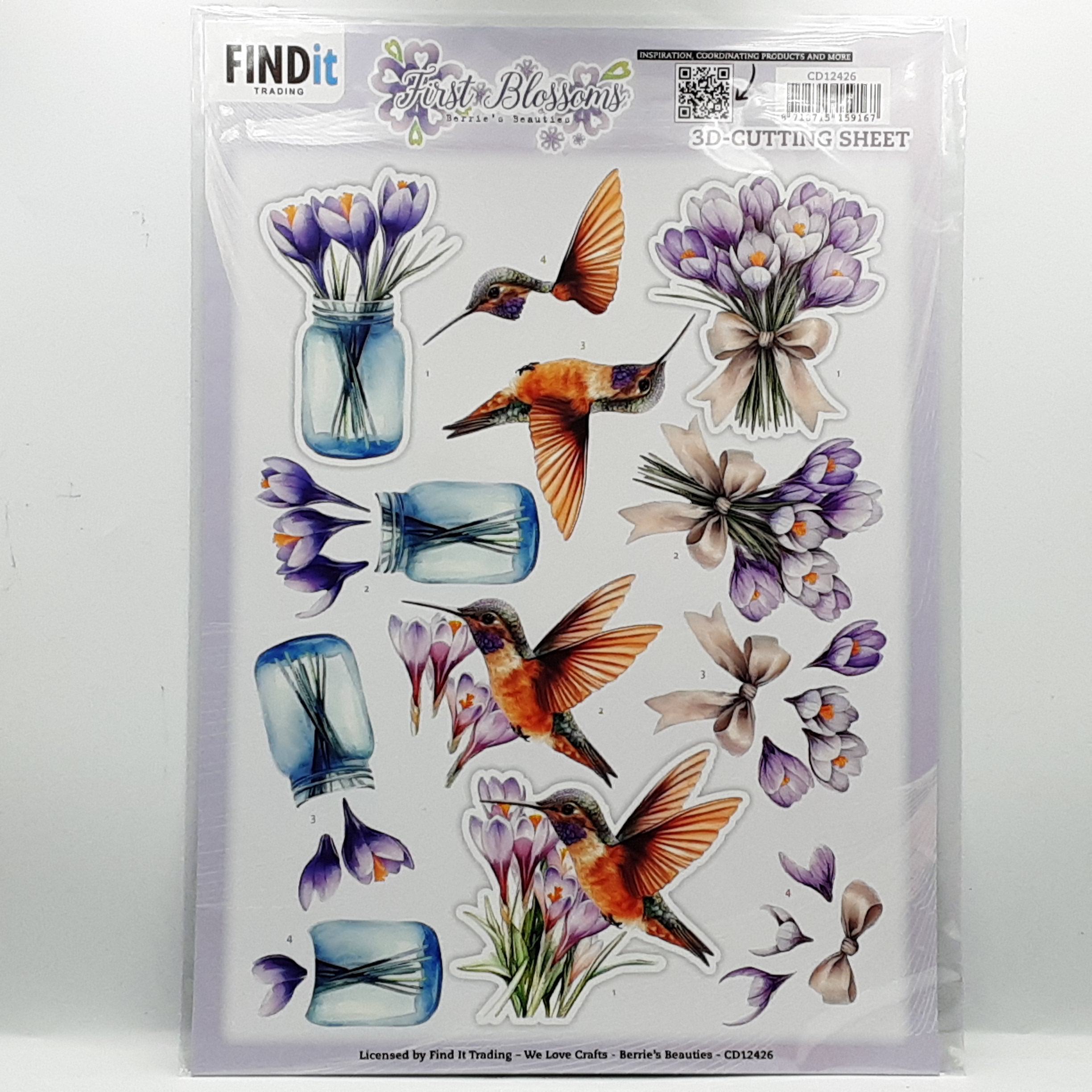 Knipvel met 3 plaatjes om in 3D op te bouwen , Ook verkrijgbaar in push out Paarse krokussen en een kolibrie