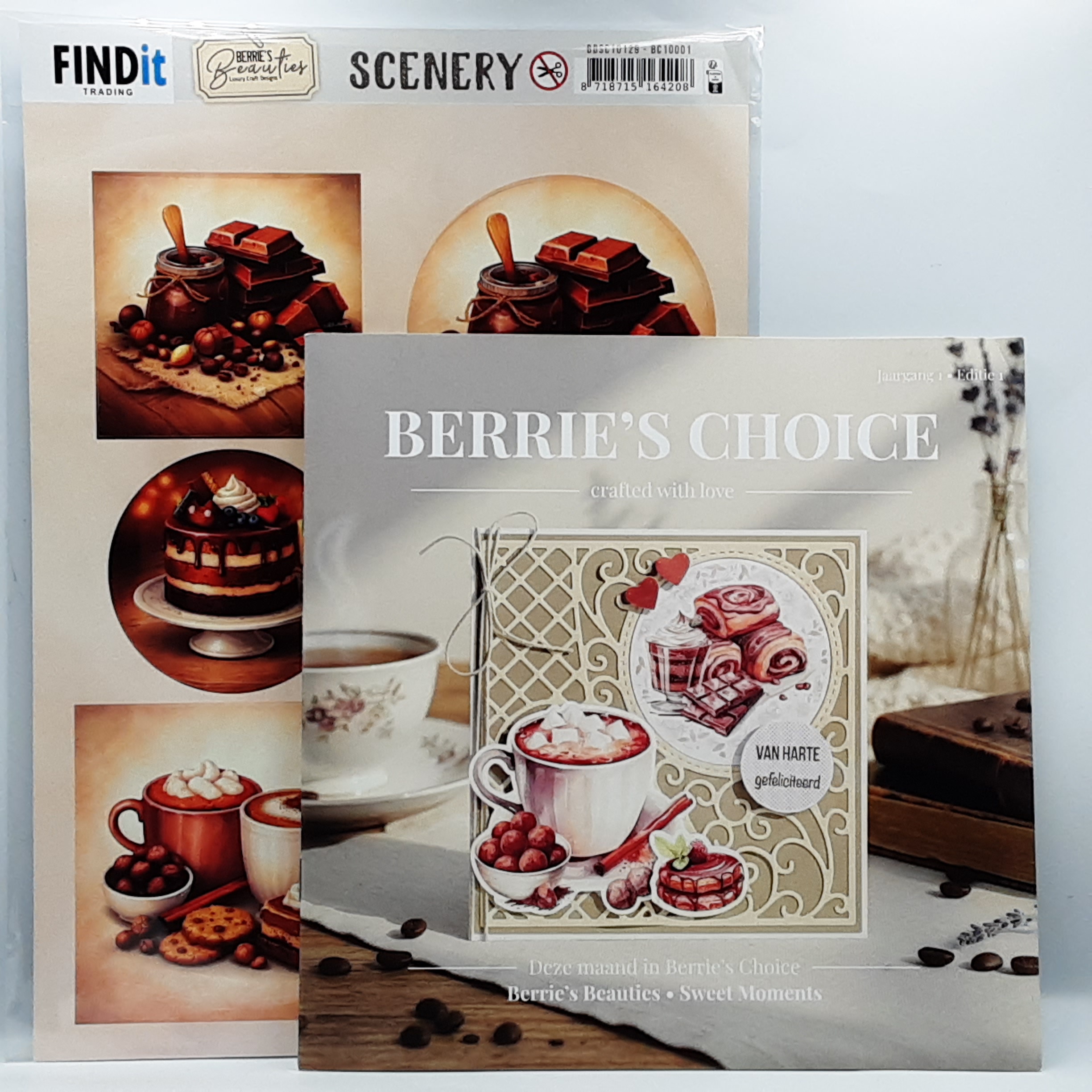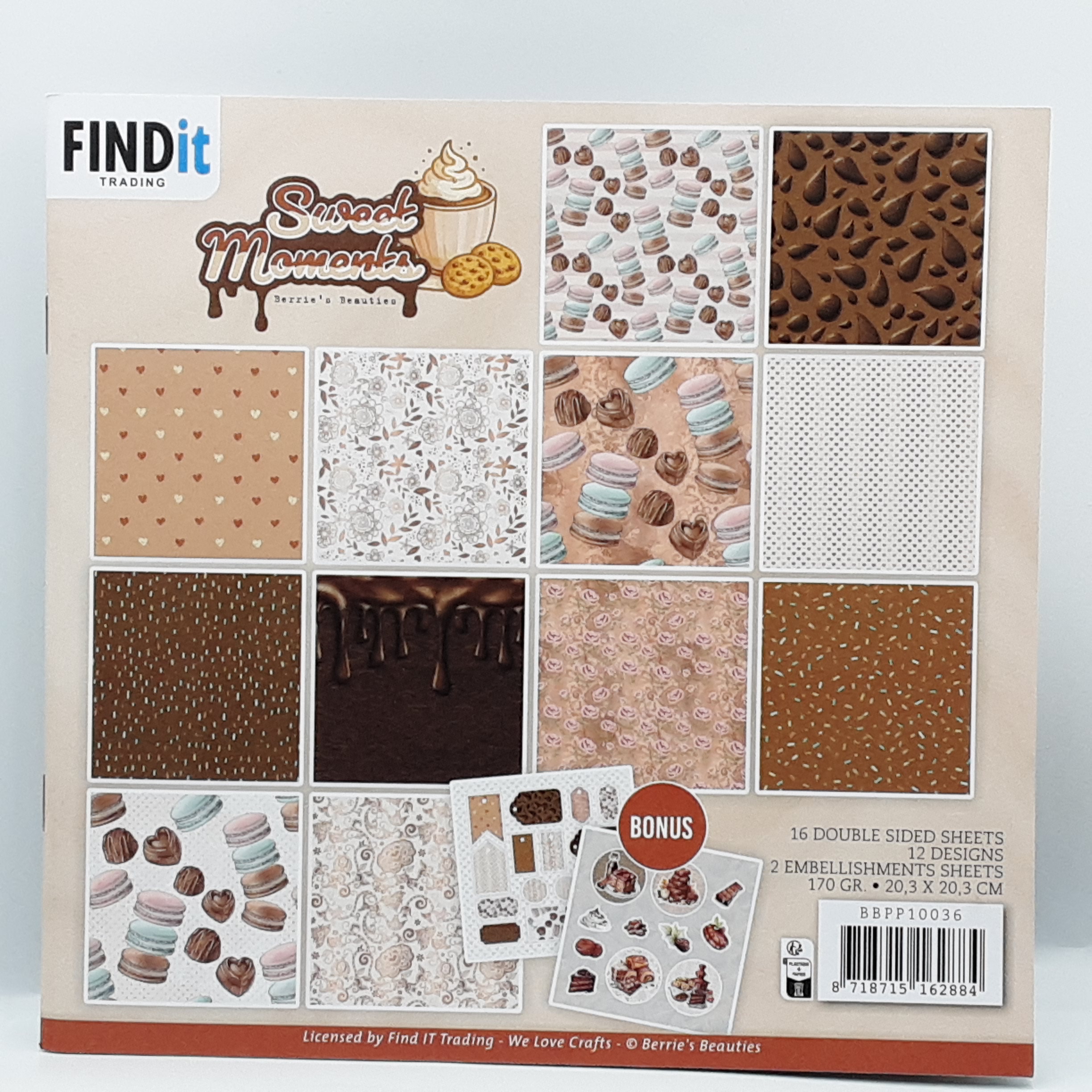 Een tijschrift met de collectie sweet moments met voorbeelden, dot en borduur patronen, en 2 velletjes designpapier, op formaat 20x20cm, bij aankoop van het boekje het scenery uitdrukvel sweet moments gratis