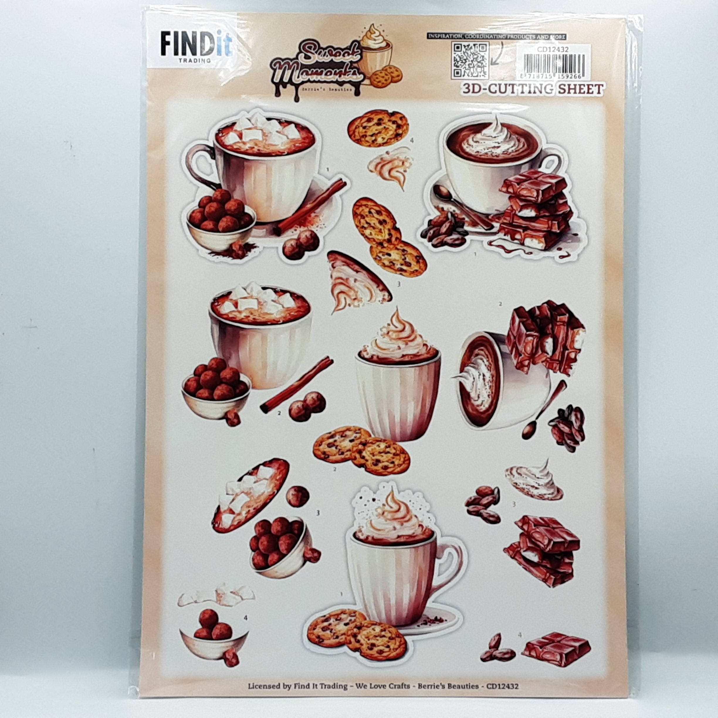 Knipvel met kopjes chocolade melk met slagroom en koekjes, ook verkrijgbaar in push out vel