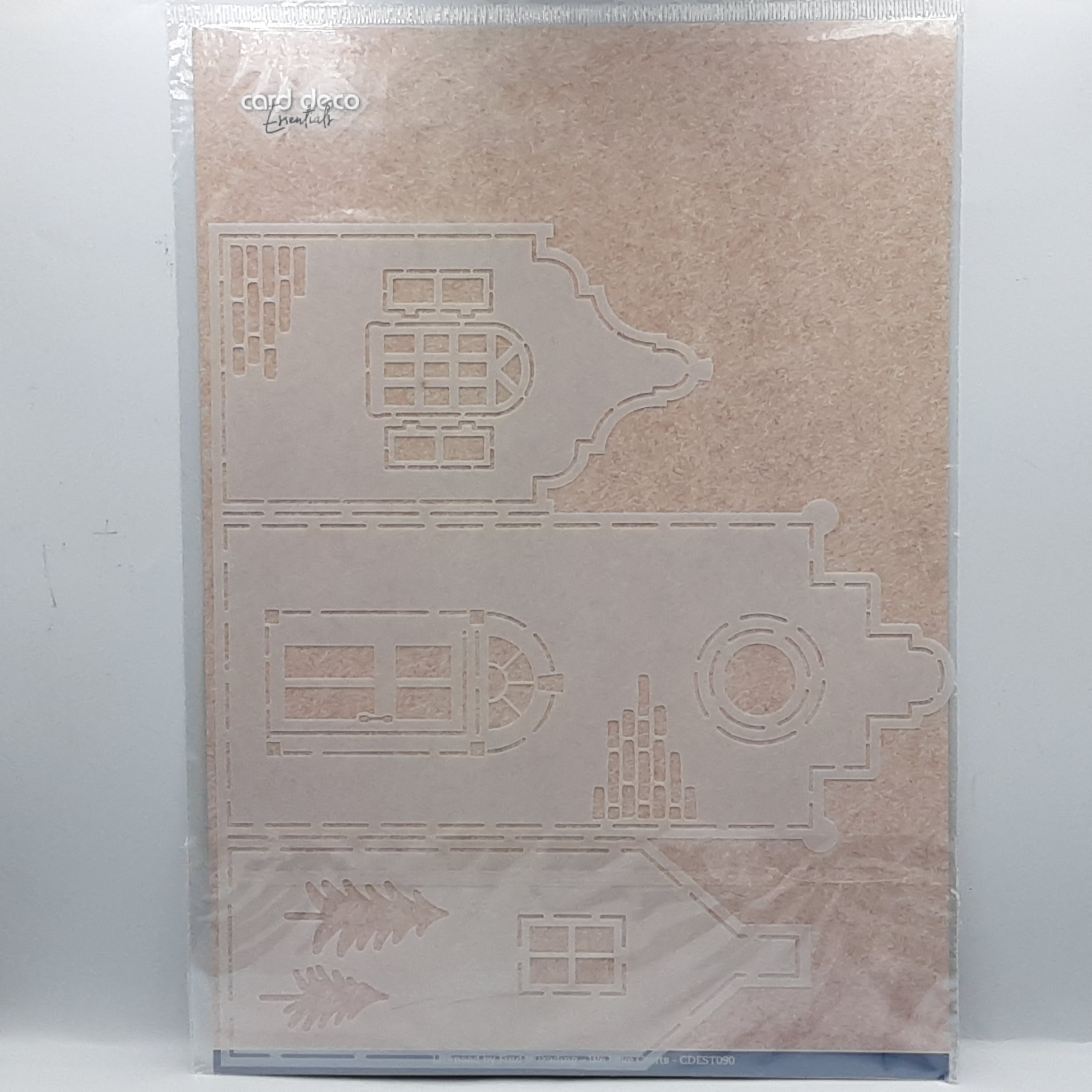 Kunststof stencil om zelf te tekenen en uit te knippen met drieluik van huisjes