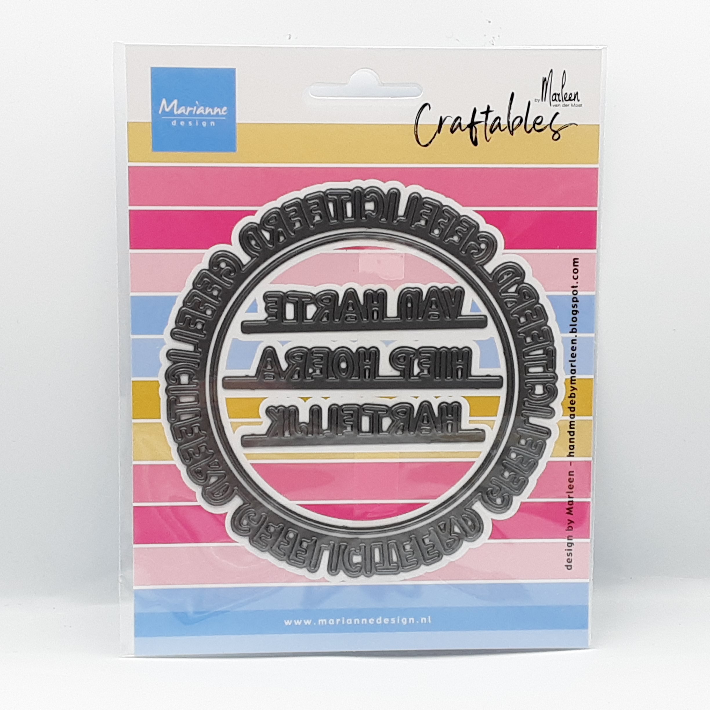 Stansmal van een cirkel met rondom de tekst gefeliciteerd en horizontale teksten, van harte, hiep hoera en hartelijk