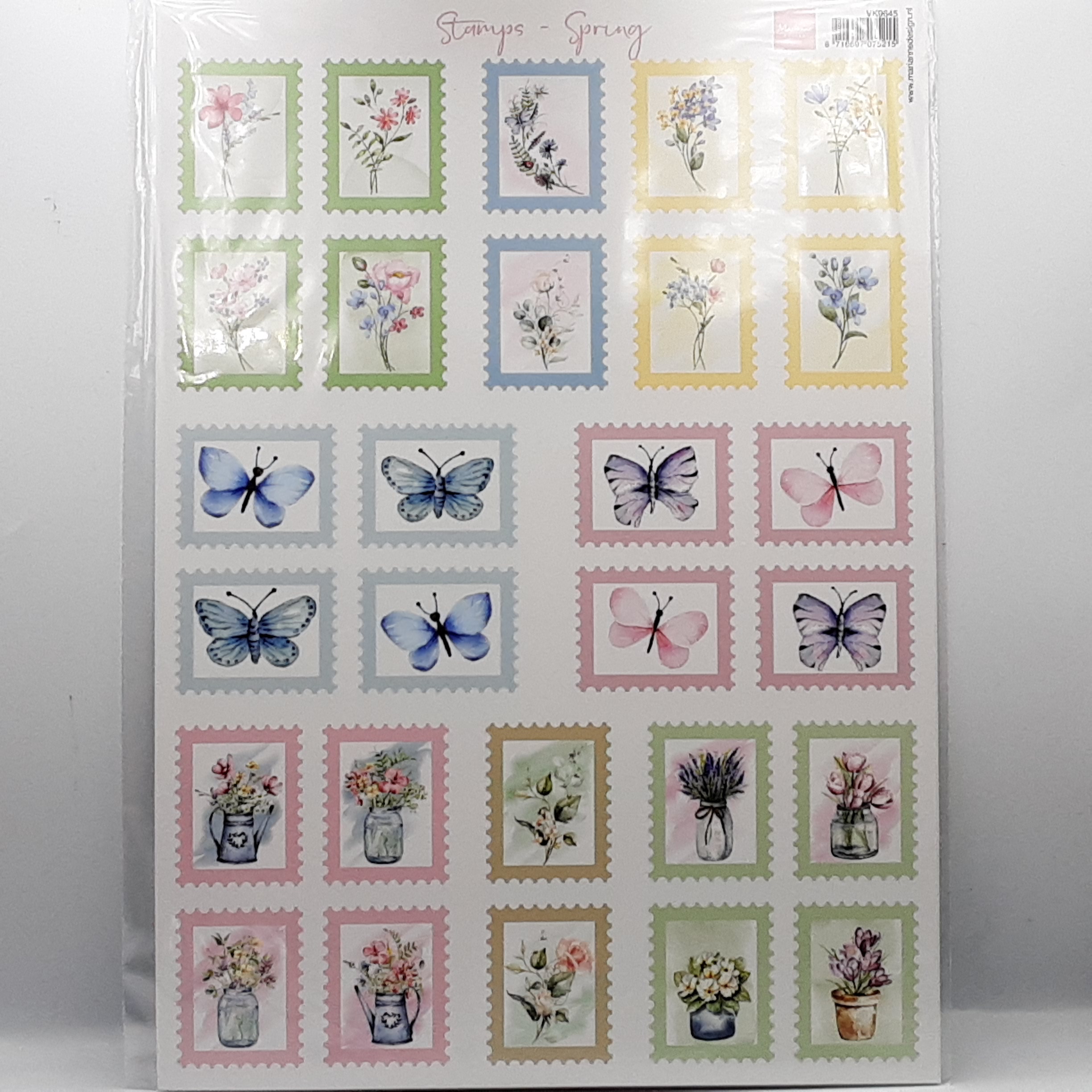 Knipvel vol rechthoekige postzegels met bloemen en vlinders, passen in de creatables stencil stamp set