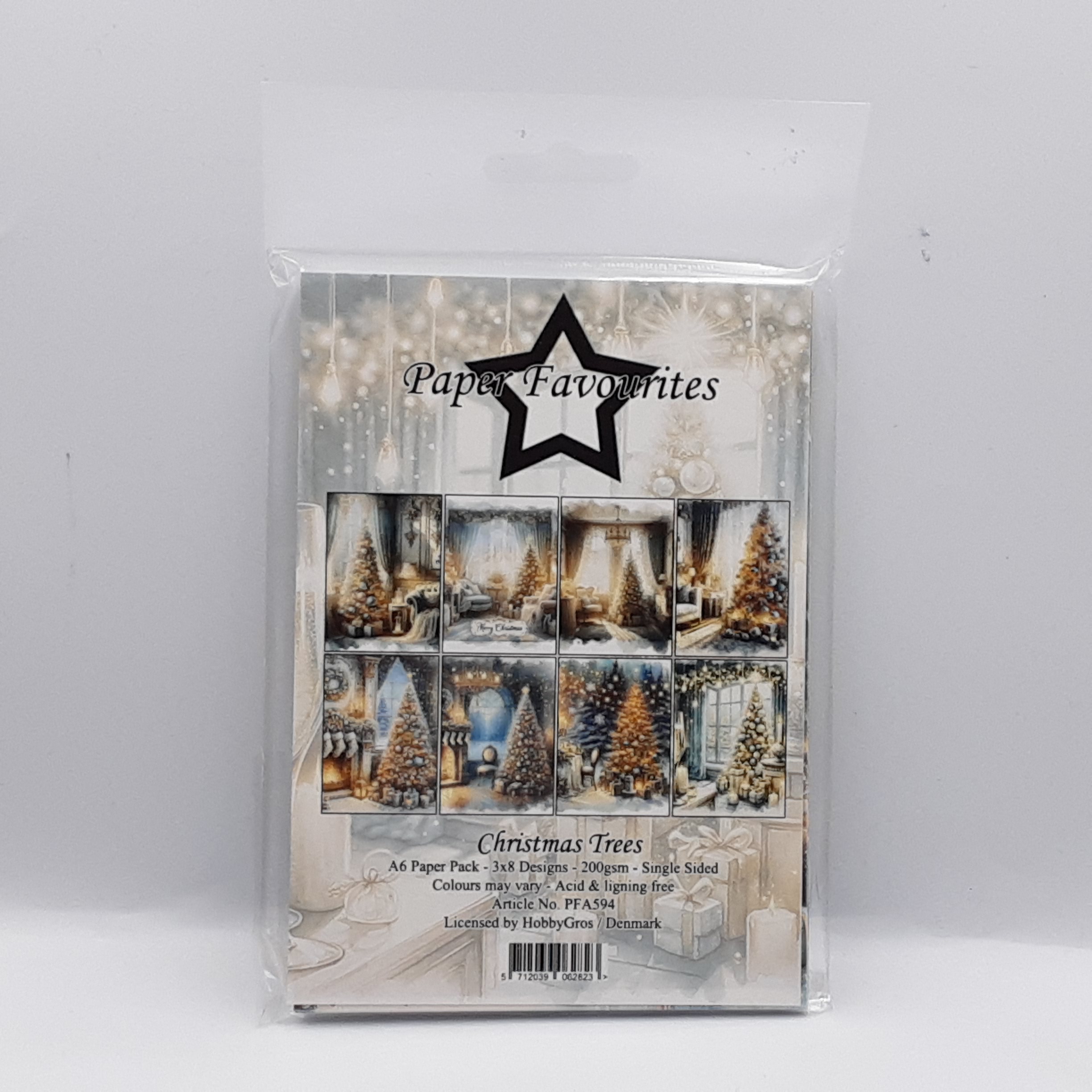 A6 paperpack met 3 x 8 designs met aangeklede kerstbomen in gouden en blauwe tinten Enkelzijdig bedrukt op 200 grams papier