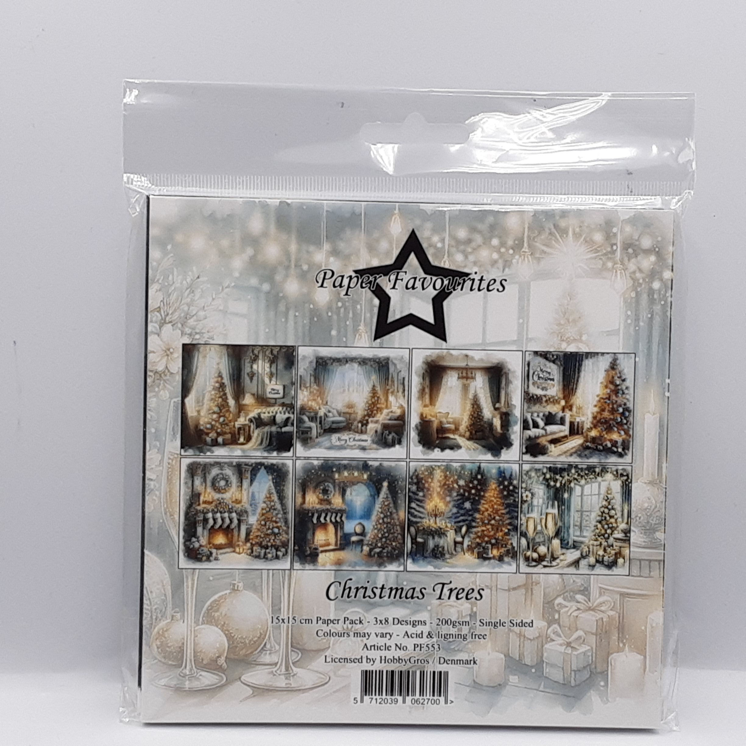 Vierkant paperpack met 3 x 8 designs met aangeklede kerstbomen in gouden en blauwe tinten Enkelzijdig bedrukt op 200 grams papier