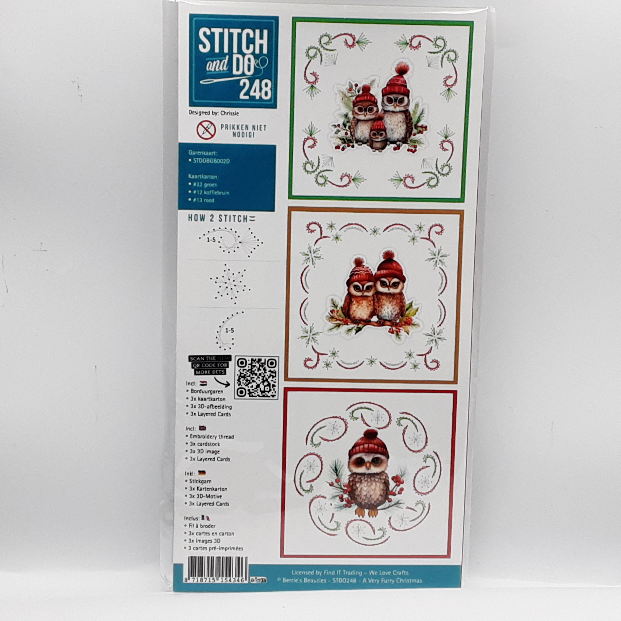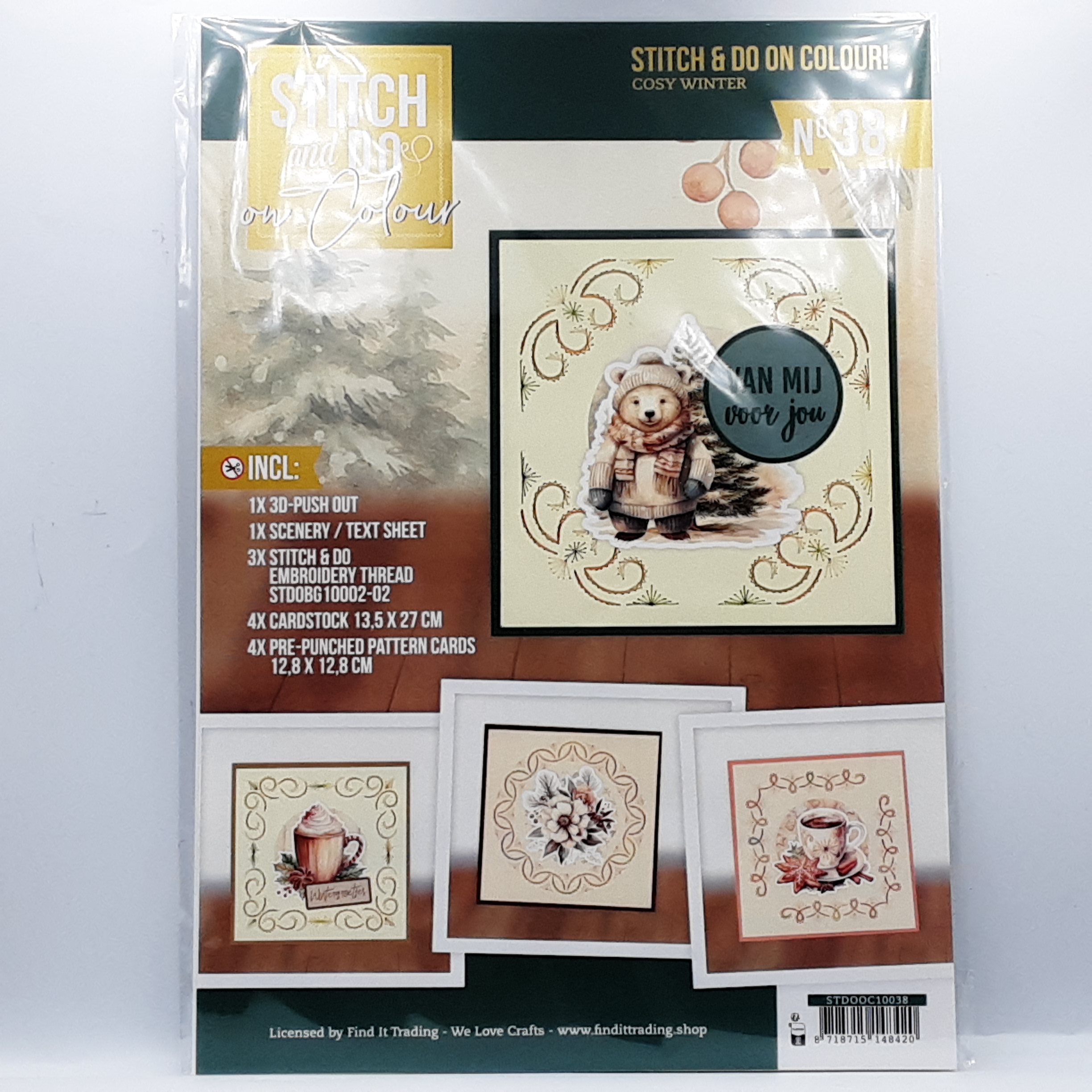 Compleet borduurpakket voor vier kaarten met borduurgaren kaartkarton 3d uitdrukplaatjes en text sheet, thema cosy winter