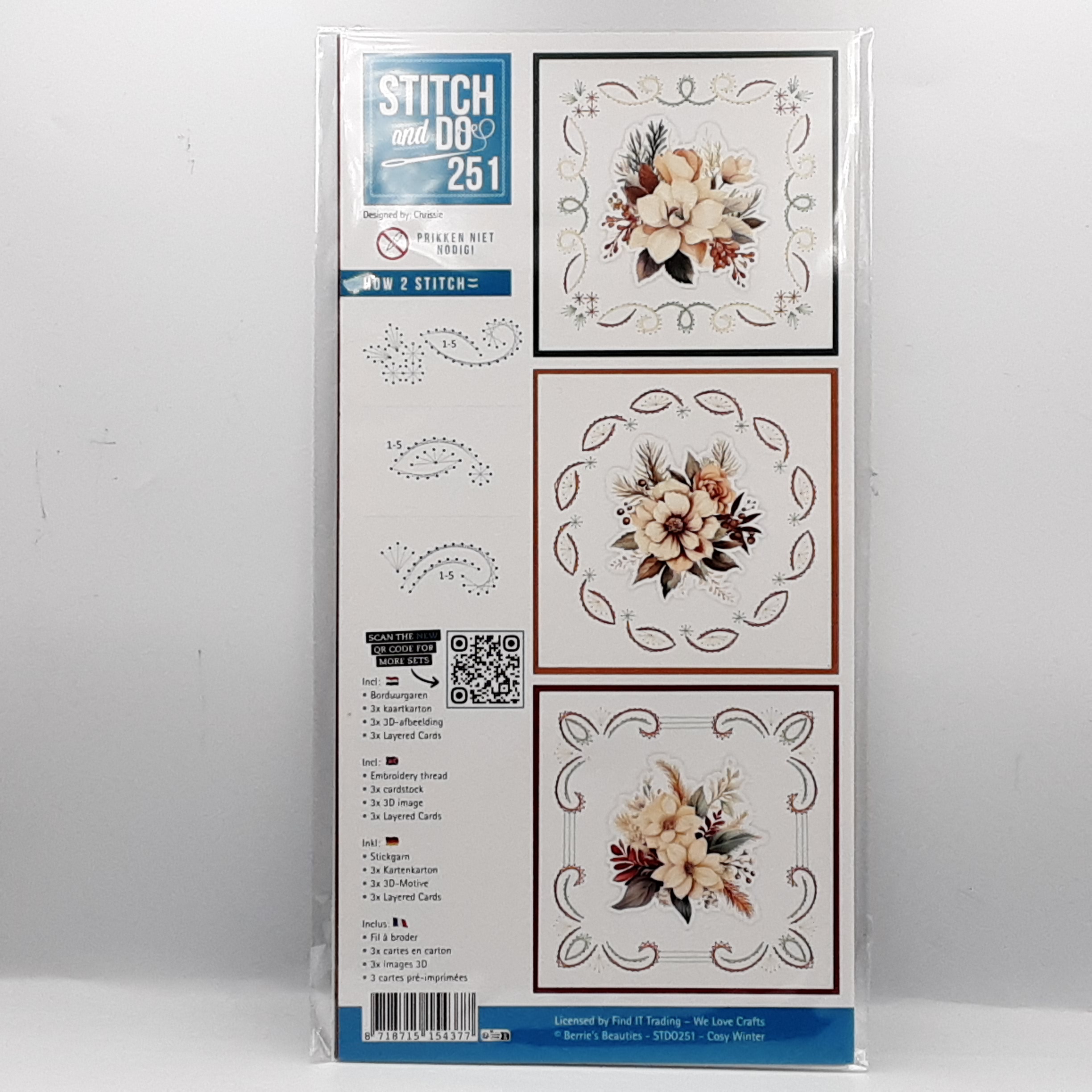 Compleet pakket voor 3 borduur kaarten, inclusief kaartkarton , voorgeprikte oplegkaarten, garen en 3D knipplaatjes Winterse bloemen