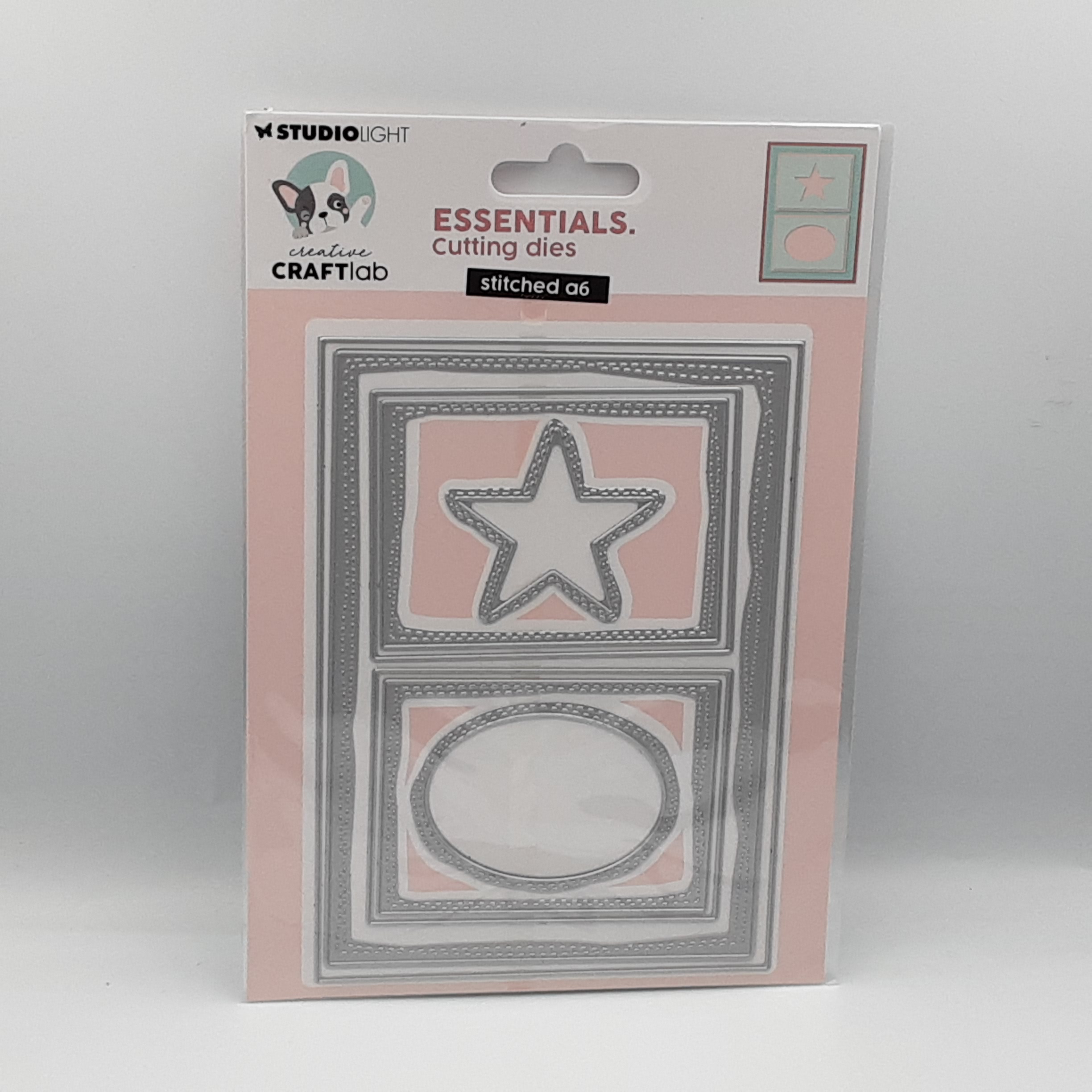 A6 stansmal met binnenzijde met stiksteekjes , daarnaast nog kleinere rechthoekjes m ster en ovaal , alles met stiksteekjes